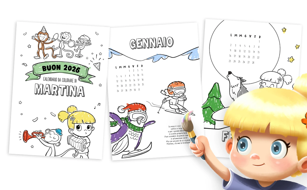 Il tuo piccolo si divertirà a colorare il nostro calendario 2026 personalizzato!